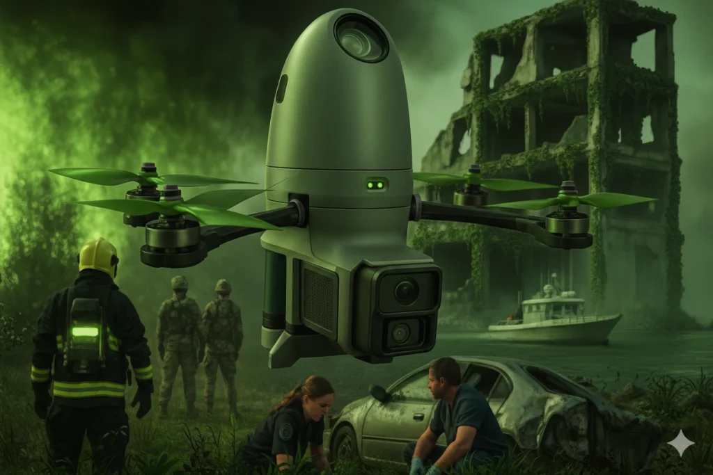 Live HD video feed to command centers and mobile response units Optional thermal imaging for detecting smoke, fire, and victims Continuous real-time GPS tracking shared with first responder teams